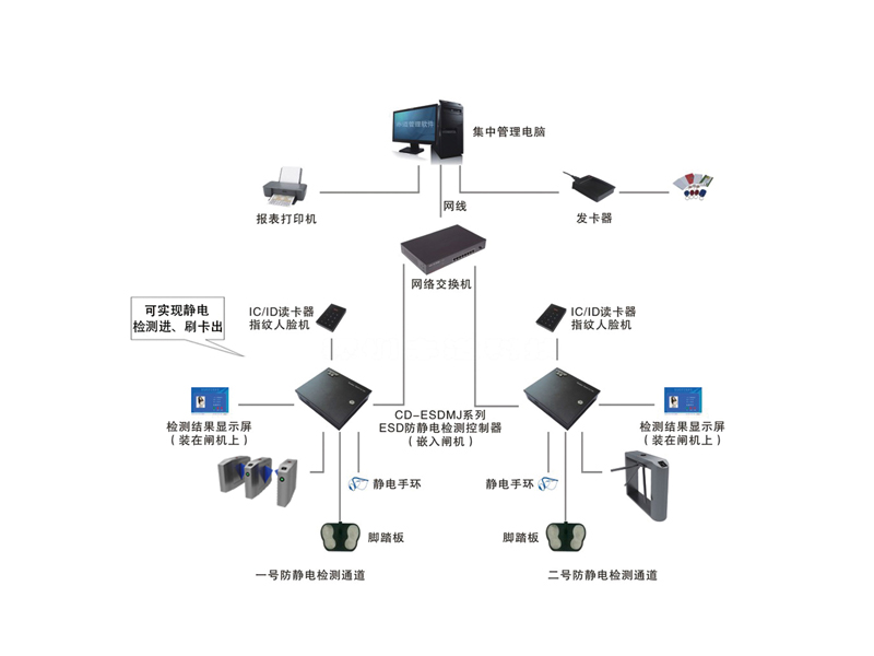 手腕带和静电鞋:刷卡后检测手腕带和静电鞋,两者检测通过后闸机自动打开,一般适用于员工